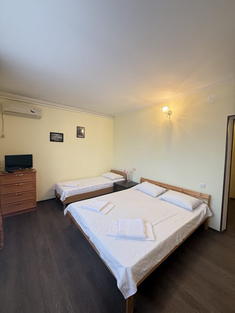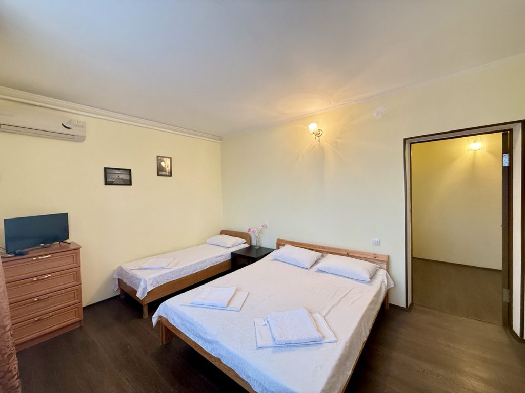 В номере четыре односпальные кровати (или две двуспальные), прикроватная тумбочка, стул, шкаф, кондиционер, телевизор . Санузел — душевая кабина, туалет, умывальник. Все номера без балкона, вид на поселок или внутренний двор. Площадь номера 15-18 кв. м.
